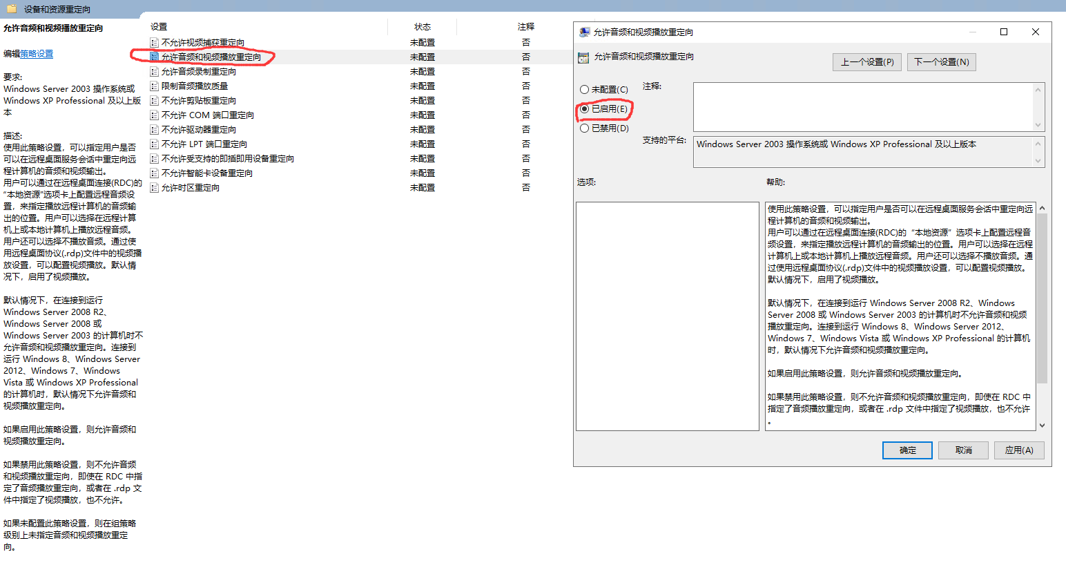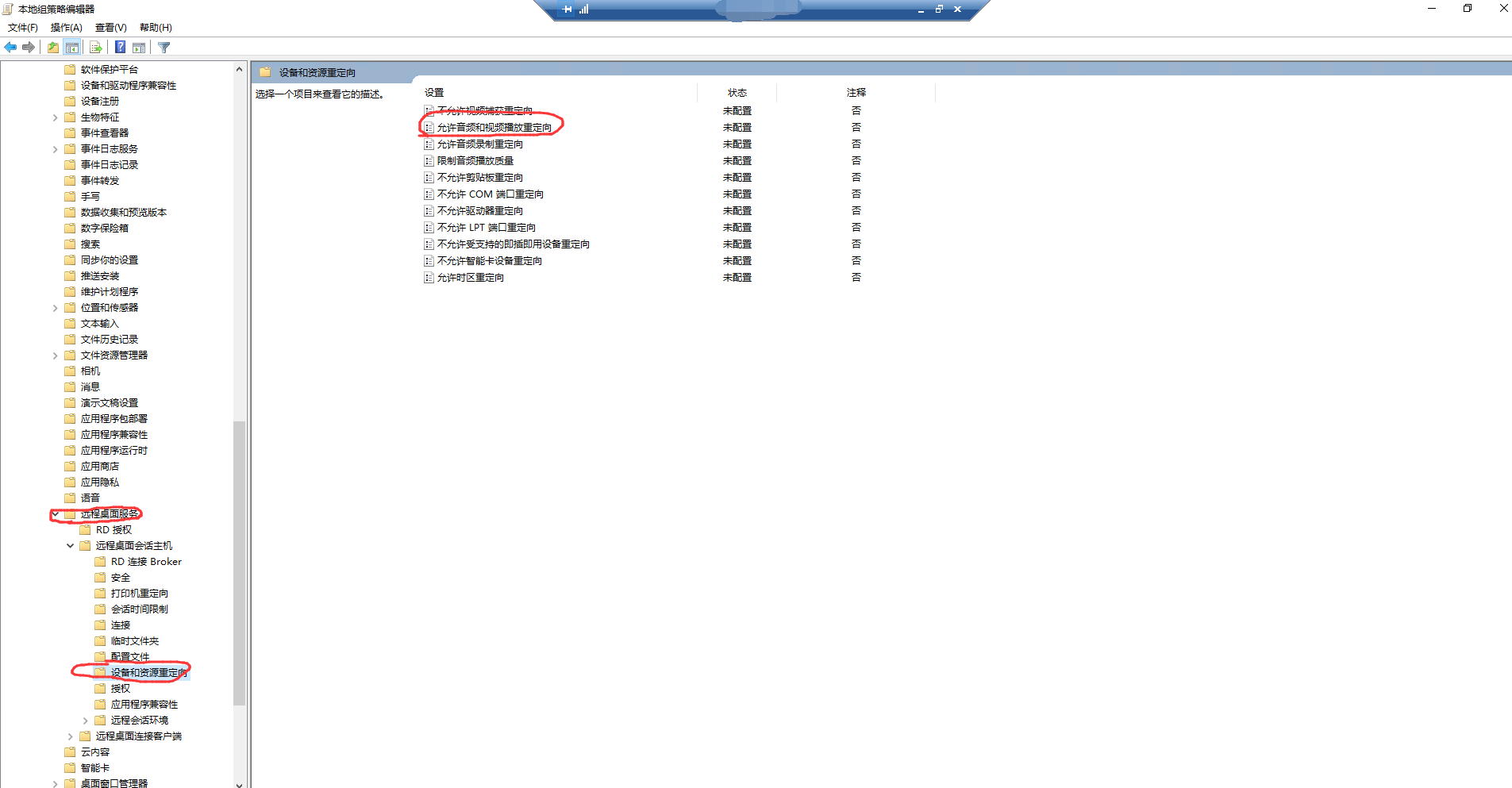 按win+r–输入gpedit.msc–运行–打开本地组策略编辑器–计算机配置–管理模板–windows组件–远程桌面会话主机–设备和资源重定向–允许音频和视频播放重定向